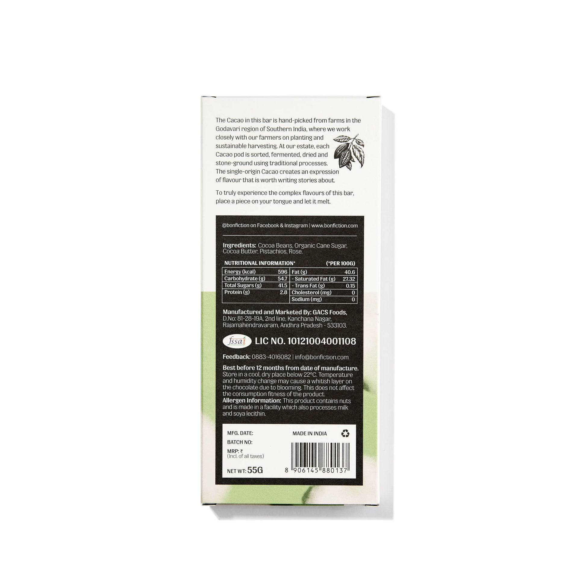 55% dark chocolate, pistachio and rose.