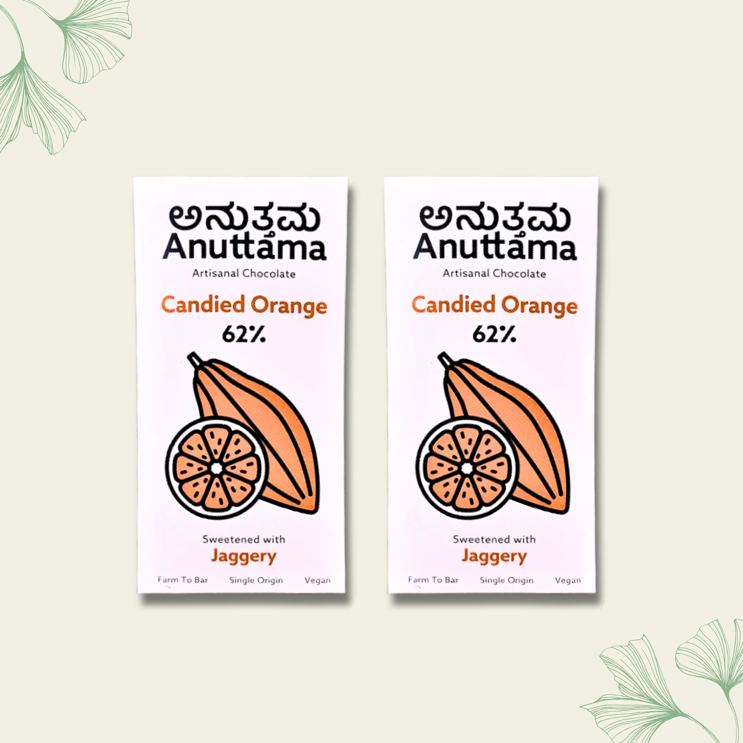 "Experience the real flavour of Cocoa Ingredients: Cocoa beans, Cocoa butter, Natural Jaggery, Candied Orange Fine dark chocolate is loaded with Candied Orange for the extra crunch. As you like it! Presenting the lightest of the lot, 62% is for the ones who like their chocolates just sweet but not the sweetest! These bars are free of refined sugar and made to fit the palate of light-dark chocolate lovers. Crafted using locally sourced cocoa beans, Anuttama chocolates are full of real cocoa flavour, sweetened with natural jaggery/unrefined cane sugar and are free from artificial flavours, oils, preservatives and additives.